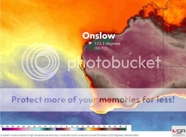 "ออนสโลว์ทำสถิติใหม่ อุณหภูมิร้อนอย่างไม่เคยปรากฏมาก่อน นับเป็นสถิติของ WA และเท่ากับวันที่ร้อนที่สุดของออสเตรเลียเมื่อ 62 ปีที่แล้ว (2 ม.ค.1960) ที่สนามบิน ในเมือง Oodnadatta SA ของรัฐเซาท์ออสเตรเลีย "