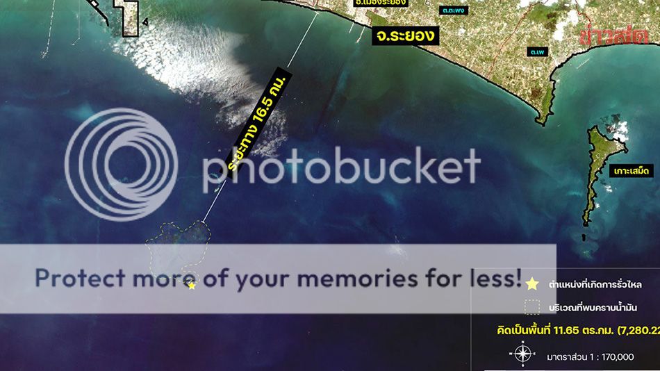 กระทรวงการอุดมศึกษา วิทยาศาสตร์ วิจัย และนวัตกรรม โดย สำนักงานพัฒนาเทคโนโลยีอวกาศและภูมิสารสนเทศ (องค์การมหาชน) หรือ GISTDA ใช้ภาพจากดาวเทียม Sentinel-2 ของวันที่ 26 ม.ค.65 เวลา 10.40 น. เบื้องต้นพบคราบน้ำมันลอยเป็นกลุ่มก้อนกลางอ่าวมาบตาพุด (กรอบสีเหลือง) คิดเป็นพื้นที่ 11.65 ตารางกิโลเมตร (7,280 ไร่) หรือกว่า 2 เท่าของเกาะเสม็ด