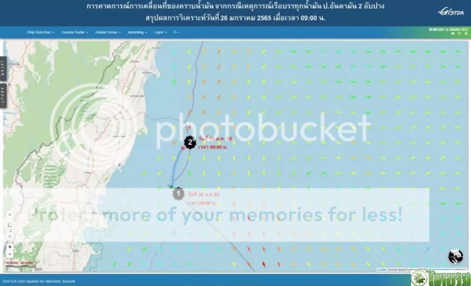 ผู้สื่อข่าวรายงานเพิ่มติมว่า เพจ GSTIDA สำนักงานพัฒนาเทคโนโลยีอวกาศและภูมิสารสนเทศ (องค์กรมหาชน) ได้มีการเผยภาพจากดาวเทียม Sentinel-1 โดยพบคราบน้ำมันยังคงอยู่บริเวณเขตจังหวัดชุมพร โดยระบุว่า เมื่อวันที่ 25 มกราคม 2565 เวลา 18.36 น. พบคราบน้ำมันลอยบริเวณชายฝั่งจังหวัดชุมพร ซึ่งมีลักษณะเป็นแผ่นฟิล์มน้ำมันจากตำแหน่งที่เรืออับปาง (ดาวสีแดง) เมื่อวันที่ 22 มกราคม 2565 ไหลย้อนขึ้นไปทางทิศเหนือ (กรอบสีเหลือง) ระยะทางกว่า 40 กิโลเมตร โดย GISTDA ได้คาดการณ์การเคลื่อนตัวและทิศทางของคราบน้ำมันไปจนถึงวันศุกร์ที่ 28 มกราคม 2565 ด้วยระบบ Geo-Spatial for Maritime System หรือ GMaS พบว่า คราบน้ำมันมีแนวโน้มเคลื่อนที่ไปทางทิศเหนือค่อนไปทางตะวันออกเฉียงเหนือ (เส้นสีน้ำเงิน) ทั้งนี้ข้อมูลจากการวิเคราะห์ทาง GISTDA จะส่งต่อให้กับหน่วยงานที่เกี่ยวข้องได้นำไปใช้วางแผนติดตามตรวจสอบในพื้นที่ต่อไป