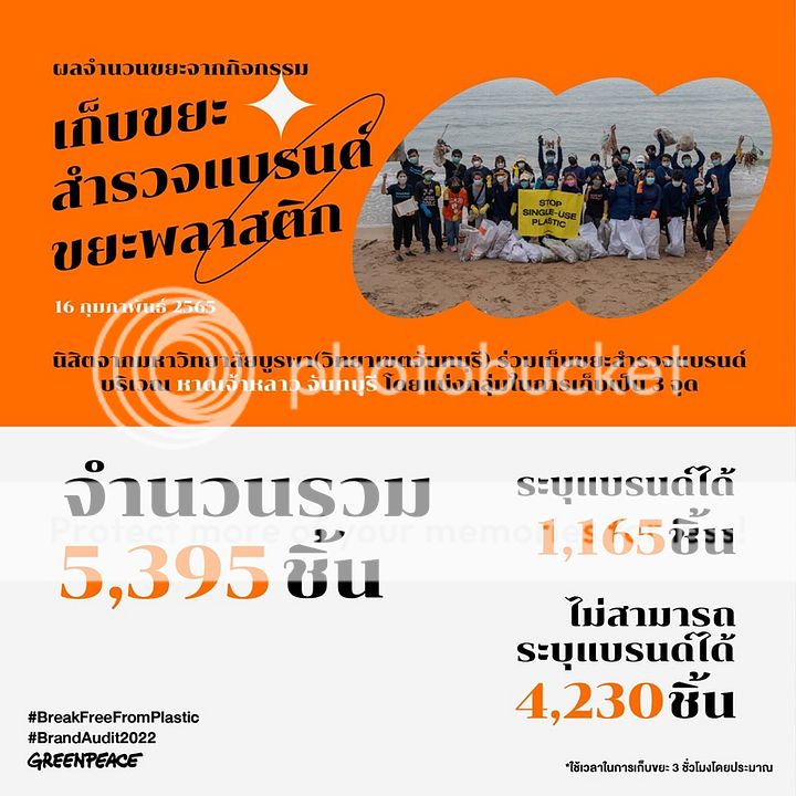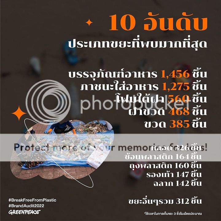 โดยสามารถจัด 10 อันดับ ได้ดังนี้ 1.บรรจุภัณฑ์อาหาร 1,456 ชิ้น 2.ภาชนะใส่อาหาร 1,275 ชิ้น 3.โฟมใต้ฝา 560 ชิ้น 4.ฝาขวด 468 ชิ้น 5.ขวด 385 ชิ้น 6.หลอด 326 ชิ้น 7.ช้อน 164 ชิ้น 8.ถุงพลาสติก 160 ชิ้น 9.รองเท้า 147 ชิ้น 10.ฉลาก 142 ชิ้น โดยมีขยะอื่นๆ รวม 312 ชิ้น สามารถระบุแบรนด์ได้ 1,165 ชิ้น และไม่สามารถระบุแบรนด์ได้ 4,230 ชิ้น (จำพวกถุงพลาสติกใส่แกง เศษพลาสติก โฟม ยางวง หลอด เป็นต้น)