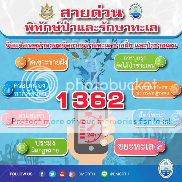 หากประชาชนพบการลักลอบทำลายทรัพยากรทางทะเล ชายฝั่ง และป่าชายเลน รวมถึงสัตว์ทะเลหายาก สามารถแจ้งมายังสายด่วนพิทักษ์ป่าและรักษาทะเล 1362