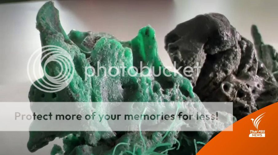 ก้อนหินที่มีบางส่วนเป็นสีเขียวสด คือ หินที่มีพลาสติกละลายปะปนเป็นส่วนหนึ่งของก้อนหินไปด้วย ถูกพบที่เกาะตรินดาจี ที่เป็นเกาะภูเขาไฟในบราซิล