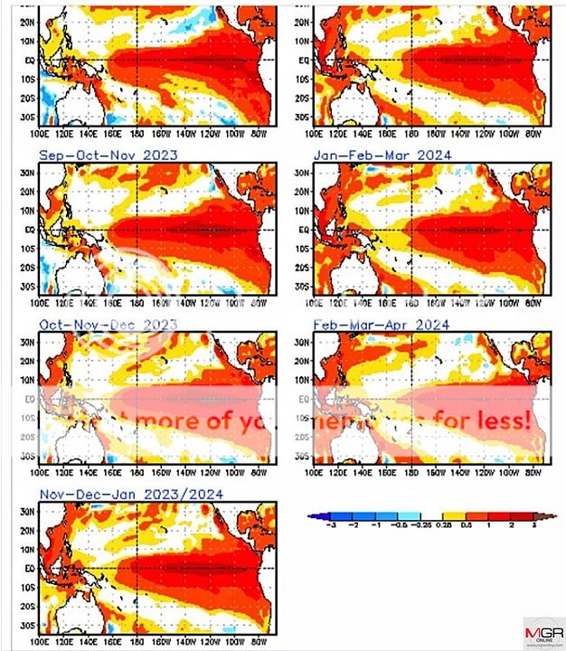 น้ำจะร้อนขยายวงกว้างจริงจัง ตั้งแต่ตุลาคมถึงธันวาคม แล้วจะเริ่มลดลง สอดคล้องกับการคาดการณ์ครั้งก่อนๆ ว่าเอลนีโญจะแรงสุดช่วงปลายปี จากนั้นจะเบาลง