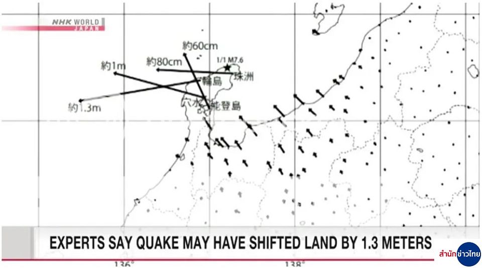 เว็บไซต์บรรษัทแพร่ภาพกระจายเสียงแห่งญี่ปุ่น หรือเอ็นเอชเค (NHK) รายงานว่า การสารสนเทศภูมิศาสตร์ของญี่ปุ่น หรือจีเอสไอ (GSI) ได้วิเคราะห์ข้อมูลระบบระบุตำแหน่งบนพื้นโลก หรือจีพีเอส (GPS) หลังจากเกิดแผ่นดินไหวขนาด 7.6 เมื่อวันจันทร์ ตัวเลขเบื้องต้นชี้ว่า แผ่นดินบริเวณจุดสังเกตการณ์ในเมืองวาจิมะมีการเคลื่อนตัวมากที่สุด โดยเคลื่อนตัวในแนวนอนไปทางตะวันตกประมาณ 1.3 เมตร นอกจากนี้ยังพบแผ่นดินเคลื่อนตัวไปทางตะวันตก 1 เมตรในเมืองอะนะมิซุ และ 80 เซนติเมตรในเมืองซูซุ ขณะที่แผ่นดินบริเวณจุดสังเกตการณ์บนเกาะโนโตะจิมะเคลื่อนตัว 60 เซนติเมตรไปทางตะวันตกเฉียงเหนือ มุ่งสู่ชายฝั่งทะเลญี่ปุ่นหรือทะเลตะวันออก