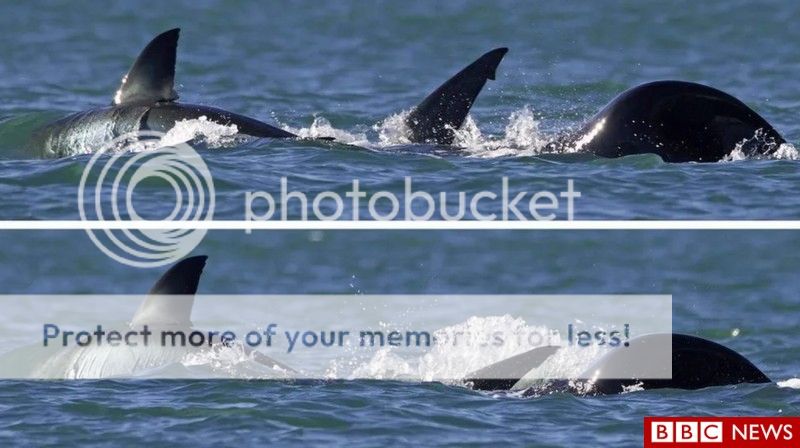 วาฬออร์กาเพียงตัวเดียว (ปรากฏทางขวาของภาพ) "ฉีกทึ้งอวัยวะ" ของฉลามออกมาได้ภายใน 2 นาที