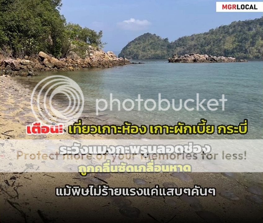 กระบี่ - อุทยานแห่งชาติธารโบกขรณี จ.กระบี่ ประกาศแจ้งเตือนนักท่องเที่ยวที่ไปท่องเที่ยวเกาะห้อง เกาะเหลาลาดิง และ เกาะผักเบี้ย ระวังแมงกะพรุนลอดช่องที่ถูกคลื่นซัดเกยหาด แม้พิษจะไม่รุนแรง แค่รู้สึกคันๆ แสบร้อนเล็กน้อย แล้วก็หายไป