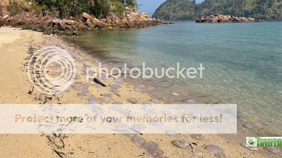 ล่าสุด เช้าวันเดียวกัน บริเวณชายหาดบนเกาะผักเบี้ย ในเขตอุทยานฯ อ.อ่าวลึก จ.กระบี่ พบซากแมงกะพรุนนับพันตัว ถูกคลื่นซัดมากองเรียงรายเต็มแนวชายหาด โดยเจ้าหน้าที่อุทยานฯ ถ่ายไว้ขณะนำเรือตรวจการณ์ออกสำรวจความเรียบร้อยในพื้นที่ ซึ่งแมงกะพรุนดังกล่าวเรียกว่า แมงกะพรุนลอดช่อง ลักษณะเป็นวุ้นใส ขนาดตั้งแต่ 3-5 นิ้ว กองเรียงรายตามริมชายหาด ระยะทาง 200-300 เมตร โดยเช้านี้พบมากที่เกาะผักเบี้ยหลังน้ำทะเลลด ขณะตามจุดเล่นน้ำที่เกาะเหลาลาดิง และเกาะห้อง ยังมีแมงกะพรุนจำนวนมากเช่นกัน ทางอุทยานฯ ต้องคอยประชาสัมพันธ์เตือนนักท่องเที่ยวเพื่อความปลอดภัย ขณะที่บางส่วนเลี่ยงที่จะลงเล่นน้ำ แต่นอนอาบแดดตามชายหาดแทน เพราะกลัวจะไปสัมผัสแมงกะพรุนแล้วเกิดอาการแพ้