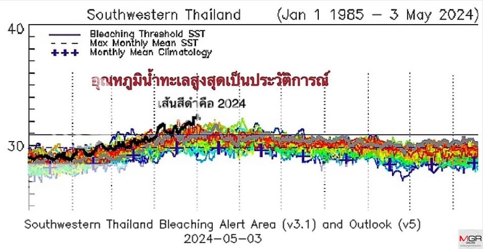 เส้นสีดำคือกราฟของปีนี้ 2024 จะเห็นว่าอุณหภูมิน้ำในช่วงนี้อยู่เหนือทุกเส้น ทำลายสถิติในรอบ 40 ปี (และอาจเป็นตลอดกาลแต่ก่อนหน้านั้นเราวัดไม่ได้) สอดคล้องกับข้อมูลน้ำจากสถานีโทรมาตรของคณะประมงที่เพิ่งนำมาให้เพื่อนธรณ์ดู ยังสอดคล้องกับข้อมูลจากหลายหน่วยที่รายงานกันเข้ามา