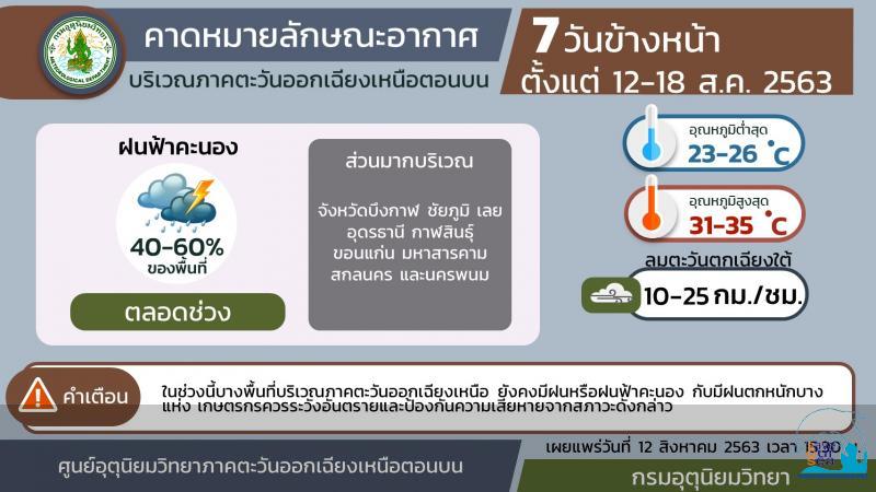สภาวะอากาศทั่วไป พยากรณ์อากาศ 24 ชั่วโมงข้างหน้า มรสุมตะวันตกเฉียงใต้พัดปกคลุมทะเลอันดามัน ประเทศไทย และอ่าวไทย ในขณะที่มีลมตะวันออกเฉียงใต้พัดเข้ามาปกคลุมภาคตะวันออกเฉียงเหนือตอนล่าง ภาคตะวันออก และอ่าวไทย ทำให้ยังคงมีฝนตกหนักบางพื้นที่บริเวณด้านรับลมของภาคเหนือ ภาคตะวันออกเฉียงเหนือตอนล่าง ภาคกลาง ภาคตะวันออก และภาคใต้ ขอให้ประชาชนที่อาศัยในพื้นที่เสี่ยงภัยบริเวณดังกล่าว ระวังอันตรายจากฝนตกหนักและฝนที่ตกสะสมไว้ด้วย กรุงเทพมหานครและปริมณฑล เมฆเป็นส่วนมาก กับมีฝนฟ้าคะนอง ร้อยละ 60 ของพื้นที่ และมีฝนตกหนักบางแห่ง อุณหภูมิต่ำสุด 26-28 องศาเซลเซียส อุณหภูมิสูงสุด 33-36 องศาเซลเซียส ลมตะวันตกเฉียงใต้ ความเร็ว 10-25 กม./ชม. คาดหมาย ในช่วงวันที่ 12 - 18 ส.ค. 63 มรสุมตะวันตกเฉียงใต้ที่พัดปกคลุมทะเลอันดามัน และประเทศไทยจะมีกำลังอ่อนลง ในขณะที่มีลมตะวันออกเฉียงใต้พัดปกคลุมบริเวณภาคตะวันออกเฉียงเหนือตอนล่าง ภาคตะวันออก และอ่าวไทย ลักษณะเช่นนี้ทำให้มีฝนตกหนักบางแห่งบริเวณภาคเหนือ ภาคตะวันออกเฉียงเหนือตอนล่าง ภาคตะวันออก และภาคใต้ สำหรับคลื่นลมบริเวณทะเลอันดามันและอ่าวไทยจะมีกำลังอ่อนลง ข้อควรระวัง ในช่วงวันที่ 12 - 18 ส.ค. 63 มรสุมตะวันตกเฉียงใต้ที่พัดปกคลุมทะเลอันดามัน และประเทศไทยจะมีกำลังอ่อนลง ในขณะที่มีลมตะวันออกเฉียงใต้พัดปกคลุมบริเวณภาคตะวันออกเฉียงเหนือตอนล่าง ภาคตะวันออก และอ่าวไทย ลักษณะเช่นนี้ทำให้มีฝนตกหนักบางแห่งบริเวณภาคเหนือ ภาคตะวันออกเฉียงเหนือตอนล่าง ภาคตะวันออก และภาคใต้ สำหรับคลื่นลมบริเวณทะเลอันดามันและอ่าวไทยจะมีกำลังอ่อนลง |