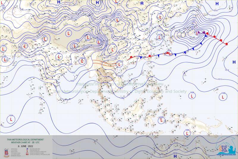 คาดหมายลักษณะอากาศ ในช่วงวันที่ 7 ? 9 มิ.ย. 65 ร่องมรสุมพาดผ่านประเทศลาวตอนบนและประเทศเวียดนามตอนบนเข้าสู่หย่อมความกดอากาศต่ำที่ปกคลุมบริเวณประเทศเวียดนามตอนบนและอ่าวตังเกี๋ย ประกอบกับมรสุมตะวันตกเฉียงใต้พัดปกคลุมทะเลอันดามัน ประเทศไทย และอ่าวไทย ทำให้ประเทศไทยตอนบนมีฝนเพิ่มขึ้นและมีฝนตกหนักบางแห่ง บริเวณภาคเหนือ ภาคตะวันออกเฉียงเหนือ ภาคกลาง รวมทั้งกรุงเทพมหานครและปริมณฑล ภาคตะวันออก ส่วนในช่วงวันที่ 10 ? 12 มิ.ย. 65 หย่อมความกดอากาศปกคลุมประเทศเวียดนามตอนบน ประกอบกับมรสุมตะวันตกเฉียงใต้กำลังที่พัดปกคลุมทะเลอันดามัน ประเทศไทย และอ่าวไทยมีกำลังแรงขึ้น ทำให้ประเทศไทยยังคงมีฝนฟ้าคะนองเกิดขึ้นและมีฝนตกหนักบางแห่ง สำหรับคลื่นลมบริเวณทะเลอันดามัน และอ่าวไทยตอนบน ทะเลมีคลื่นสูง 1-2 เมตร บริเวณที่มีฝนฟ้าคะนองคลื่นสูงมากกว่า 2 เมตร ตลอดช่วง