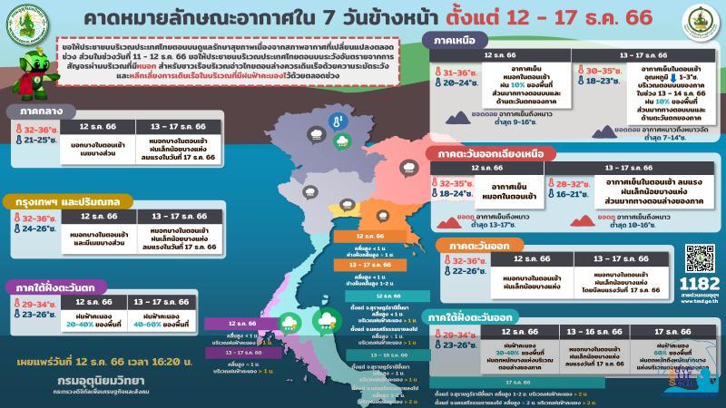 สภาวะอากาศทั่วไป พยากรณ์อากาศ 24 ชั่วโมงข้างหน้า บริเวณความกดอากาศสูงหรือมวลอากาศเย็นอีกระลอกหนึ่งจากประเทศจีนแผ่ลงมาปกคลุมภาคตะวันออกเฉียงเหนือตอนบนของประเทศไทยและทะเลจีนใต้ ลักษณะเช่นนี้ทำให้ประเทศไทยตอนบนมีหมอกในตอนเช้า ภาคเหนือและภาคตะวันออกเฉียงเหนือยังคงมีอากาศเย็นในตอนเช้า ในขณะที่มีคลื่นกระแสลมฝ่ายตะวันตกพัดปกคลุมภาคเหนือตอนบน ทำให้บริเวณดังกล่าวมีฝนฟ้าคะนองบางแห่ง ขอให้ประชาชนบริเวณประเทศไทยตอนบนดูแลรักษาสุขภาพเนื่องจากสภาพอากาศที่เปลี่ยนแปลงและระมัดระวังในการสัญจรผ่านบริเวณที่มีหมอกไว้ด้วย สำหรับมรสุมตะวันออกเฉียงเหนือที่พัดปกคลุมอ่าวไทยและภาคใต้เริ่มมีกำลังแรงขึ้น ทำให้ภาคใต้ตอนล่างมีฝนฟ้าคะนองเพิ่มขึ้น ส่วนคลื่นลมบริเวณอ่าวไทยตอนล่างสูง 1 - 2 เมตร และบริเวณที่มีฝนฟ้าคะนองคลื่นสูงมากกว่า 2 เมตร กรุงเทพมหานครและปริมณฑล มีหมอกบางในตอนเช้า อุณหภูมิต่ำสุด 25-26 องศาเซลเซียส อุณหภูมิสูงสุด 34-36 องศาเซลเซียส ลมตะวันออก ความเร็ว 10-15 กม./ชม. คาดหมาย ในช่วงวันที่ 13 ? 16 ธ.ค. 66 บริเวณความกดอากาศสูงหรือมวลอากาศเย็นกำลังอ่อนอีกระลอกหนึ่งจากประเทศจีนจะแผ่ลงมาปกคลุมภาคเหนือ และภาคตะวันออกเฉียงเหนือของประเทศไทย และทะเลจีนใต้ ในขณะที่มีคลื่นกระแสลมฝ่ายตะวันตกเคลื่อนผ่านภาคเหนือตอนบน ลักษณะเช่นนี้ทำให้บริเวณดังกล่าวยังคงมีอากาศเย็นในตอนเช้า และมีฝนฟ้าคะนองบางแห่งในภาคเหนือ สำหรับมรสุมตะวันออกเฉียงเหนือที่พัดปกคลุมอ่าวไทยและภาคใต้มีกำลังปานกลาง ทำให้ภาคใต้ตอนล่างมีฝนตกหนักบางแห่ง ส่วนคลื่นบริเวณอ่าวไทยตอนบนและทะเลอันดามัน มีคลื่นสูงประมาณ 1 เมตร บริเวณที่มีฝนฟ้าคะนองคลื่นสูงมากกว่า 1 เมตร อ่าวไทยตอนล่างมีคลื่นสูง 1 - 2 เมตร บริเวณที่มีฝนฟ้าคะนองคลื่นสูงมากกว่า 2 เมตร ส่วนในช่วงวันที่ 17 - 18 ธ.ค. 66 บริเวณความกดอากาศสูงหรือมวลอากาศเย็นกำลังค่อนข้างแรงอีกระลอกหนึ่งจากประเทศจีนจะแผ่เสริมลงมาปกคลุมประเทศไทยตอนบนและทะเลจีนใต้ ทำให้บริเวณดังกล่าวมีอุณหภูมิลดลงกับมีลมแรง โดยบริเวณภาคเหนือและภาคตะวันออกเฉียงเหนือ อุณหภูมิจะลดลง 2 ? 4 องศาเซลเซียส ส่วนภาคกลาง รวมทั้งกรุงเทพมหานครและปริมณฑล และภาคตะวันออก อุณหภูมิจะลดลง 1 ? 3 องศาเซลเซียส สำหรับมรสุมตะวันออกเฉียงเหนือที่พัดปกคลุมอ่าวไทยและภาคใต้เริ่มมีกำลังแรงขึ้น ทำให้ภาคใต้ตอนล่างมีฝนตกหนักถึงหนักมากบางแห่ง ส่วนคลื่นลมบริเวณ อ่าวไทยมีกำลังแรงขึ้น โดยบริเวณอ่าวไทยตอนบน มีคลื่นสูง 1 - 2 เมตร บริเวณที่มีฝนฟ้าคะนองคลื่นสูงมากก