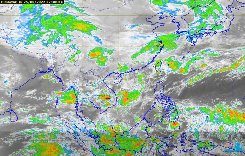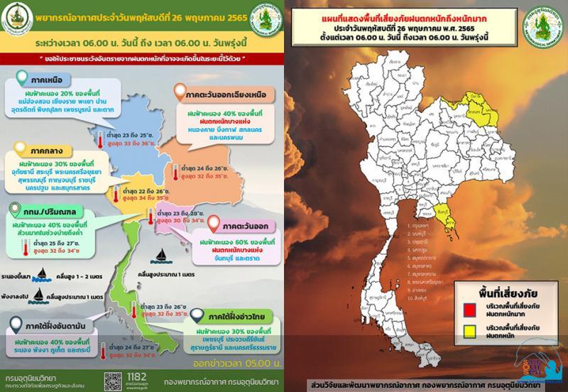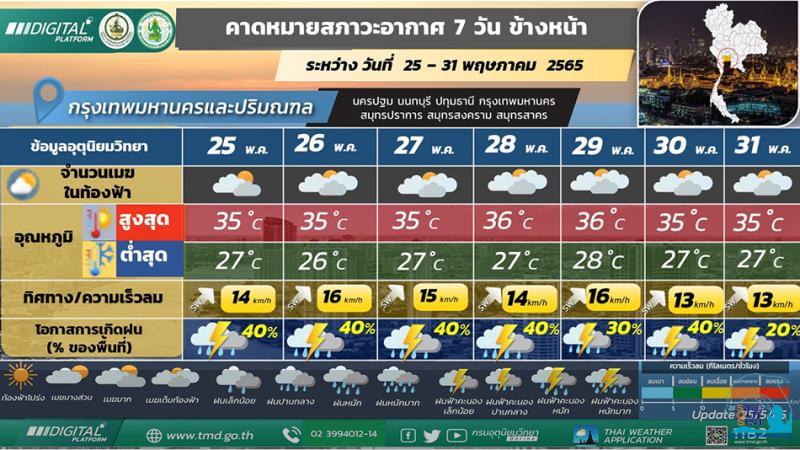 สภาวะอากาศทั่วไป ร่องมรสุมกำลังอ่อนพาดผ่านบริเวณประเทศลาวตอนบน และประเทศเวียดนามตอนบนเข้าสู่หย่อมความกดอากาศต่ำที่ปกคลุมบริเวณประเทศเวียดนามตอนบนและอ่าวตังเกี๋ย ประกอบกับมรสุมตะวันตกเฉียงใต้กำลังปานกลางที่พัดปกคลุมทะเลอันดามัน ประเทศไทย และอ่าวไทยมีกำลังอ่อนลง ลักษณะเช่นนี้ทำให้ประเทศไทยยังคงมีฝนฟ้าคะนอง และมีฝนตกหนักบางแห่งบริเวณภาคตะวันออกเฉียงเหนือ และภาคตะวันออก จึงขอให้ประชาชนในบริเวณดังกล่าวระวังอันตรายจากฝนตกหนักที่อาจจะเกิดขึ้นในระยะนี้ไว้ด้วย อนึ่ง ในช่วงวันที่ 27 ? 31 พ.ค. 65 มรสุมตะวันตกเฉียงใต้ที่พัดปกคลุมทะเลอันดามัน ประเทศไทย และอ่าวไทยจะมีกำลังแรงขึ้น ประกอบกับร่องมรสุมพาดผ่านตอนบนของภาคเหนือเข้าสู่หย่อมความกดอากาศต่ำที่ปกคลุมบริเวณอ่าวตังเกี๋ย ลักษณะเช่นนี้ทำให้ประเทศไทยจะมีฝนเพิ่มขึ้น และมีฝนตกหนักถึงหนักมากบางแห่งบริเวณภาคตะวันออกเฉียงเหนือ ภาคกลาง ภาคตะวันออก และภาคใต้ สำหรับคลื่นลมบริเวณทะเลอันดามันและอ่าวไทยจะมีกำลังแรง โดยบริเวณทะเลอันดามัน มีคลื่นสูง 2-3 เมตรส่วนอ่าวไทยตอนบนมีคลื่นสูงประมาณ 2 เมตร บริเวณที่มีฝนฟ้าคะนองคลื่นสูงมากกว่า 3 เมตร กรุงเทพมหานครและปริมณฑล มีฝนฟ้าคะนองร้อยละ 30 ของพื้นที่ ส่วนมากในช่วงบ่ายถึงค่ำ อุณหภูมิต่ำสุด 27-28 องศาเซลเซียส อุณหภูมิสูงสุด 32-34 องศาเซลเซียส ลมตะวันตกเฉียงใต้ ความเร็ว 10-20 กม./ชม. คาดหมาย ในช่วงวันที่ 25 - 26 พ.ค. 65 ร่องมรสุมพาดผ่านประเทศลาวตอนบนและประเทศเวียดนามตอนบนเข้าสู่หย่อมความกดอากาศต่ำที่ปกคลุมบริเวณชายฝั่งประเทศเวียดนามตอนบนและอ่าวตังเกี๋ย ประกอบกับมรสุมตะวันตกเฉียงใต้ที่พัดปกคลุมทะเลอันดามัน ประเทศไทย และอ่าวไทยมีกำลังปานกลาง ลักษณะเช่นนี้ทำให้ประเทศไทยมีฝนฟ้าคะนองเกิดขึ้น ส่วนคลื่นลมบริเวณทะเลอันดามันและอ่าวไทยจะมีกำลังปานกลาง โดยบริเวณทะเลอันดามันตอนบนมีคลื่นสูง 2 เมตร บริเวณที่มีฝนฟ้าคะนองคลื่นสูงมากกว่า 2 เมตร ส่วนในช่วงวันที่ 27 ? 31 พ.ค. 65 มรสุมตะวันตกเฉียงใต้ที่พัดปกคลุมทะเลอันดามัน ประเทศไทย และอ่าวไทยจะมีกำลังแรงขึ้น ประกอบกับร่องมรสุมที่พาดผ่านตอนบนของภาคเหนือเข้าสู่หย่อมความกดอากาศต่ำที่ปกคลุมบริเวณอ่าวตังเกี๋ย ลักษณะเช่นนี้ทำให้ประเทศไทยมีฝนเพิ่มขึ้น และมีฝนตกหนักถึงหนักมากบางแห่งบริเวณภาคตะวันออกเฉียงเหนือ ภาคกลาง ภาคตะวันออก และภาคใต้ สำหรับคลื่นลมบริเวณทะเลอันดามันและอ่าวไทยจะมีกำลังแรง โดยบริเวณทะเลอันดามัน มีคลื่นสูง 2-3 เมตร ส่วนอ่าวไทยตอนบนมีคลื่นสูงประมาณ 2 เมตร บ