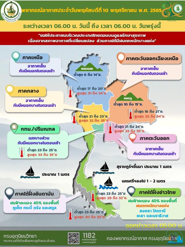 ในช่วงวันที่ 9 - 10 พ.ย. 65 บริเวณความกดอากาศสูงหรือมวลอากาศเย็นกำลังปานกลางปกคลุมประเทศไทยตอนบน ทำให้ประเทศไทยตอนบนมีอากาศเย็นถึงหนาวกับมีหมอกในตอนเช้า โดยมีฝนเล็กน้อยบางแห่งในภาคตะวันออก สำหรับร่องมรสุมยังคงพาดผ่านบริเวณภาคใต้ตอนล่าง ในขณะที่มรสุมตะวันออกเฉียงเหนือที่พัดปกคลุมอ่าวไทย ภาคใต้ และทะเลอันดามันมีกำลังอ่อนลง ทำให้ภาคใต้มีฝนลดลง แต่ยังคงมีฝนตกหนักบางแห่ง