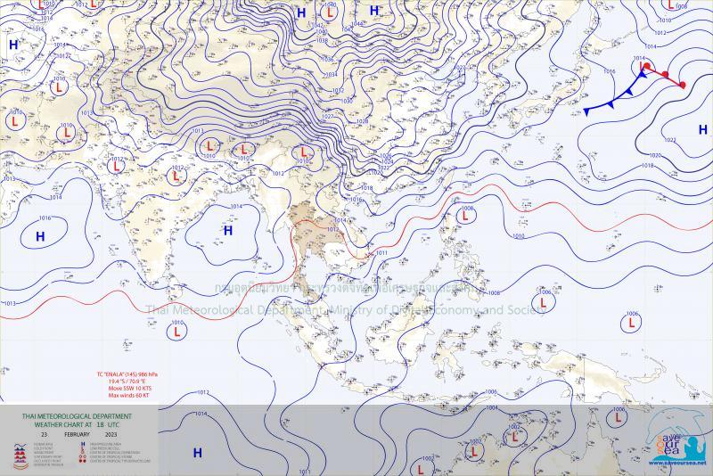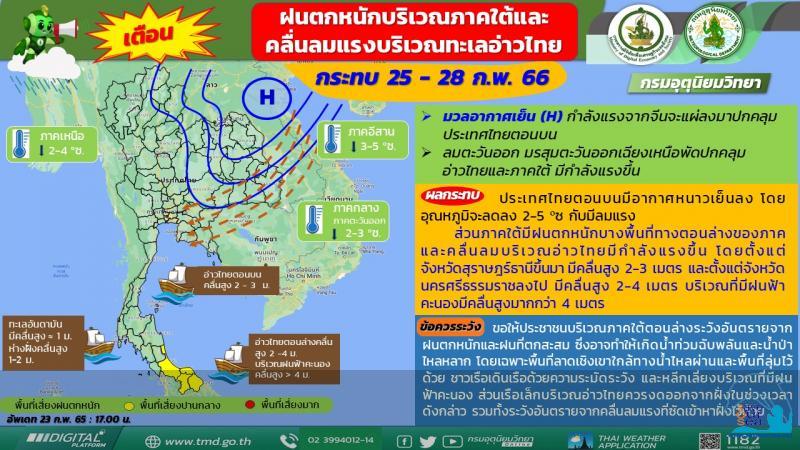 ในช่วงวันที่ 23 ? 24 ก.พ. 66 บริเวณความกดอากาศสูงหรือมวลอากาศเย็นกำลังปานกลางปกคลุมประเทศไทยตอนบน ทำให้ประเทศไทยตอนบนยังคงมีอากาศเย็นถึงหนาวในตอนเช้า ส่วนมรสุมตะวันออกเฉียงเหนือที่พัดปกคลุมอ่าวไทย ภาคใต้ และทะเลอันดามัน ทำให้ภาคใต้มีฝนน้อย ส่วนคลื่นลมบริเวณอ่าวไทยตอนล่างคลื่นสูง 1 ? 2 เมตร บริเวณที่มีฝนฟ้าคะนองคลื่นสูงมากกว่า 2 เมตร สำหรับในช่วงวันที่ 25 ? 27 ก.พ. 66 บริเวณความกดอากาศสูงหรือมวลอากาศเย็นกำลังแรงจากประเทศจีนจะแผ่เสริมลงมาปกคลุมประเทศไทยตอนบนและทะเลจีนใต้ ทำให้ประเทศไทยตอนบนมีอากาศหนาวเย็นลง อุณหภูมิจะลดลง 2 - 4 องศาเซลเซียส กับมีลมแรง ส่วนมรสุมตะวันออกเฉียงเหนือที่พัดปกคลุมอ่าวไทย ภาคใต้ และทะเลอันดามันจะมีกำลังแรงขึ้น ทำให้ภาคใต้ตอนล่างมีฝนเพิ่มขึ้นและมีฝนตกหนักบางแห่ง คลื่นลมบริเวณอ่าวไทยมีกำลังค่อนข้างแรง โดยมีคลื่นสูง 2 - 4 เมตร บริเวณที่มีฝนฟ้าคะนองคลื่นสูงมากกว่า 4 เมตร ส่วนทะเลอันดามันห่างฝั่งมีคลื่นสูง 1 - 2 เมตร ส่วนในช่วงวันที่ 28 ก.พ. ? 1 มี.ค. 66 บริเวณความกดอากาศสูงหรือมวลอากาศเย็นที่ปกคลุมประเทศไทยตอนบนมีเริ่มกำลังอ่อนลง ทำให้บริเวณดังกล่าวมีอุณหภูมิสูงขึ้น กับมีหมอกในตอนเช้า