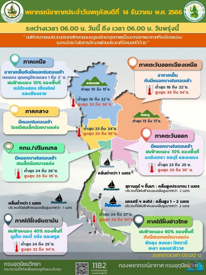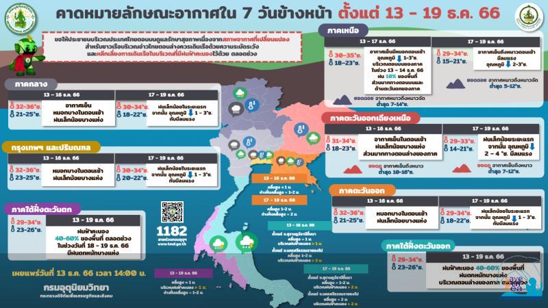 ในช่วงวันที่ 13 ? 16 ธ.ค. 66 บริเวณความกดอากาศสูงหรือมวลอากาศเย็นจากประเทศจีนแผ่ลงมาปกคลุมภาคเหนือ และภาคตะวันออกเฉียงเหนือของประเทศไทย และทะเลจีนใต้ ในขณะที่มีคลื่นกระแสลมฝ่ายตะวันตกเคลื่อนผ่านภาคเหนือตอนบน ลักษณะเช่นนี้ทำให้บริเวณดังกล่าวยังคงมีอากาศเย็นในตอนเช้า และมีฝนฟ้าคะนองบางแห่งในภาคเหนือ สำหรับมรสุมตะวันออกเฉียงเหนือที่พัดปกคลุมอ่าวไทยและภาคใต้มีกำลังปานกลาง ทำให้ภาคใต้ตอนล่างมีฝนตกหนักบางแห่ง ส่วนคลื่นบริเวณอ่าวไทยตอนบนและทะเลอันดามัน มีคลื่นสูงประมาณ 1 เมตร บริเวณที่มีฝนฟ้าคะนองคลื่นสูงมากกว่า 1 เมตร อ่าวไทยตอนล่างมีคลื่นสูง 1 - 2 เมตร บริเวณที่มีฝนฟ้าคะนองคลื่นสูงมากกว่า 2 เมตร