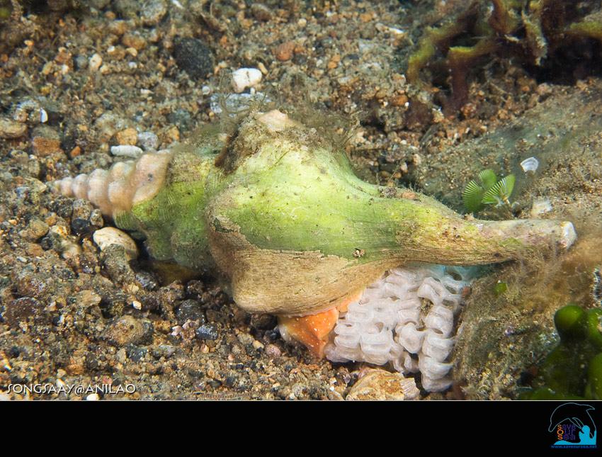 หอยอีกชนิดหนึ่ง เป็นหอยสังข์ Horse Conch (Fusinus mauiensis ) ขนาดใหญ่กว่าฝ่ามือ ที่กำลังออกไข่