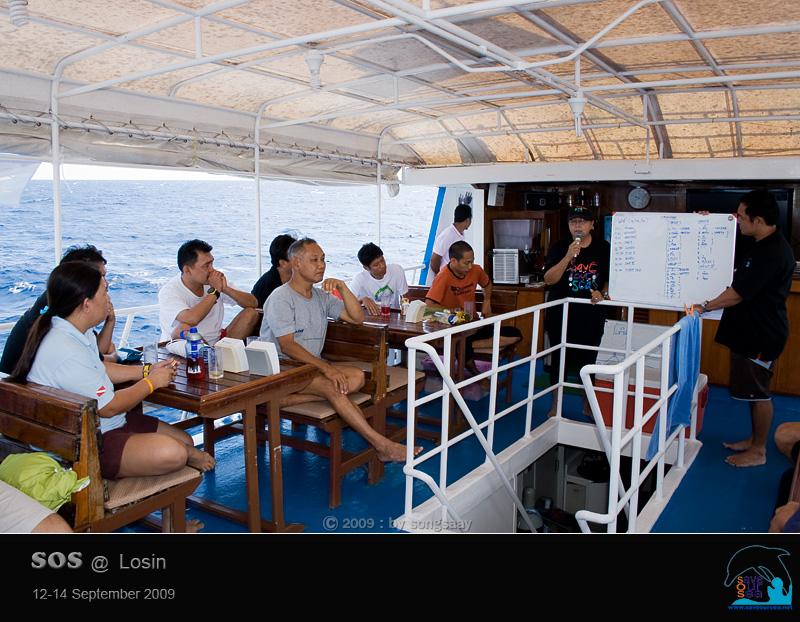 ห้าทุ่มของคืนวันที่ 11 กันยายน 2552...เรือโชคศุลี ได้นำมาชิก sos จำนวน 27 คน ออกเดินทางจากท่าเรือเมืองสงขลา มุ่งหน้าล่องไปทางตะวันออกเฉียงใต้สู่กองหินโลซิน ซึ่งอยู่กลางอ่าวไทยด้านติดกับพรมแดนประเทศมาเลเซีย สายลมโชยพัดผ่านมาทางทิศตะวันตกเฉียงใต้ ทำให้เกิดคลื่นกระทบกราบเรือด้านขวาเป็นระยะๆ อาการเอียงซ้ายทีขวาทีเหมือนเปลที่ถูกแกว่งไกว ทำให้เราพอรู้สึกได้ตลอดเวลาที่นอนหลับๆตื่นๆอยู่บนเรือ เกือบสิบโมงเช้าของวันใหม่....เราจึงเห็นประภาคารบนกองหินเล็กๆที่เรียกว่า "กองหินโลซิน" เมื่อทุกคนพร้อมแล้ว...การสรุปเรื่องเรือ กฎ..กติกา..มารยาทในการดำน้ำ ความปลอดภัยในการดำน้ำ วิธีการเก็บขยะและตัดอวนอย่างถูกวิธี และการแบ่งกลุ่มดำน้ำ ก็ได้เริ่มขึ้นตามธรรมเนียมปฏิบัติของ sos