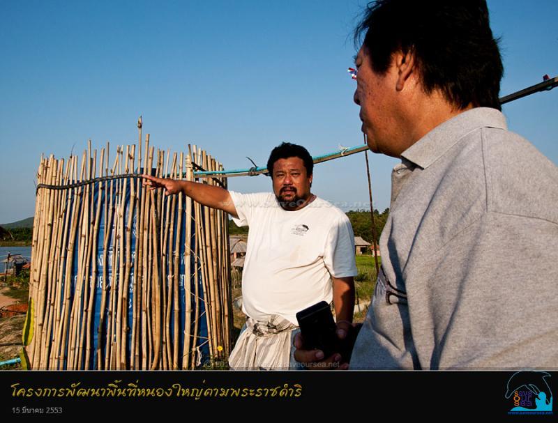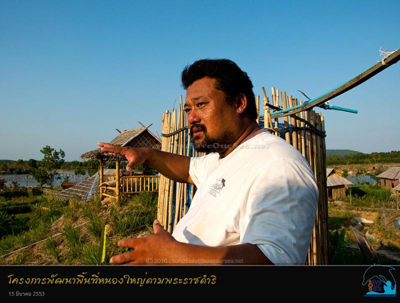 น้องพงษ์ (ขจรพงษ์ อนันตเมฆ) ซึ่งท่านผู้ว่าฯ การัณย์ ได้ส่งให้มาเป็นผู้พาเราไปที่หนองใหญ่ ได้พาเราไปพบน้องกอล์ฟ (พิทักษ์ ธเนศถาวรกุล) ผู้จัดการศูนย์การเรียนรู้ตามปรัชญาเศรษฐกิจพอเพียง ชุมพร น้องกอล์ฟ หนุ่มมาดเข้ม ที่ควรจะเป็นศิลปินเพลงเพื่อชีวิต หรือ ศิลปินวาดภาพศิลปฝีมือดี แต่กลับเป็นผู้ที่มารับใช้แผ่นดิน พาเราเดินไปที่เนินดินสูง บนเกาะหมายเลข ๙ ของพื้นที่โครงการพัฒนาพื้นที่หนองใหญ่ และเล่าให้เราฟังว่า "โครงการพัฒนาหนองใหญ่ ต.บางลึก อ.เมือง ชาวชุมพรส่วนใหญ่เรียกว่าแก้มลิงหนองใหญ่ เกิดขึ้นตามพระราชดำริของพระบาทสมเด็จพระเจ้าอยู่หัว ที่ทรงต้องการช่วยแก้ปัญหาอุทกภัย หลังเกิดเหตุพายุไต้ฝุ่นเกย์เมื่อปี 2532 และน้ำท่วมใหญ่ปลายเดือนสิงหาคม 2540 ซึ่งเริ่มโครงการตั้งแต่ปี 2541 รองรับน้ำที่ไหลบ่ามาจากตอนเหนือของจังหวัด ระบายลงสู่คลองระบายน้ำหัววัง-พนังตัก ต.นาชะอัง อ.เมือง ลงสู่อ่าวพนังตัก ทำให้ตัวเมืองชุมพรรอดพ้นจากอุทกภัยมากว่า 11 ปีแล้ว นอกจากนี้ยังเก็บกักน้ำไว้ใช้ในหน้าแล้งด้วย....."