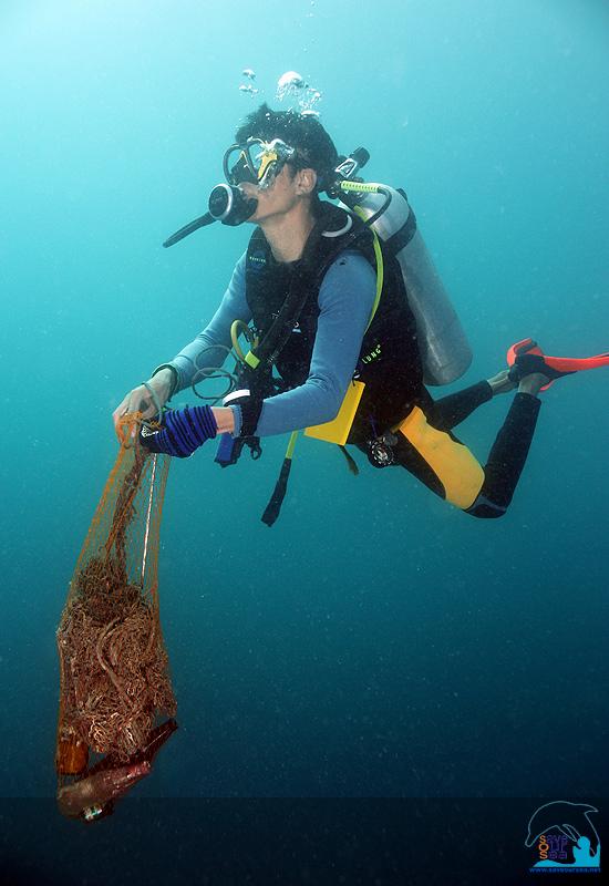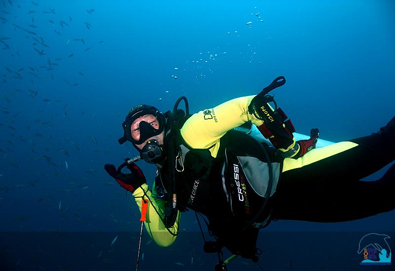 ถ้าไดฟ์ไหนรู้ล่วงหน้าว่าจะต้องลงไปตัดอวนก็จะไม่ได้ถือกล้องลงน้ำนะคะ ขอข้ามไปไดฟ์ที่สองของวันต่อมาเลยค่ะ เราลงกันที่หินใบด้านตะวันตก ดำสวนกับพี่สายชล เลยแอบเก็บภาพมาด้วย กล้องที่พี่สายชลถืออยู่ตัวใหญ่มาก เข้าใจถึงความเหน็ดเหนื่อยของพี่เลยค่ะ ไม่ง่ายเลยที่จะดำน้ำและถือกล้องหนักขนาดนี้ไปด้วย ทำให้มีภาพการทำงานใต้น้ำออกมาถ่ายทอดให้พวกเราได้ชมกัน นับถือจริงๆค่ะ