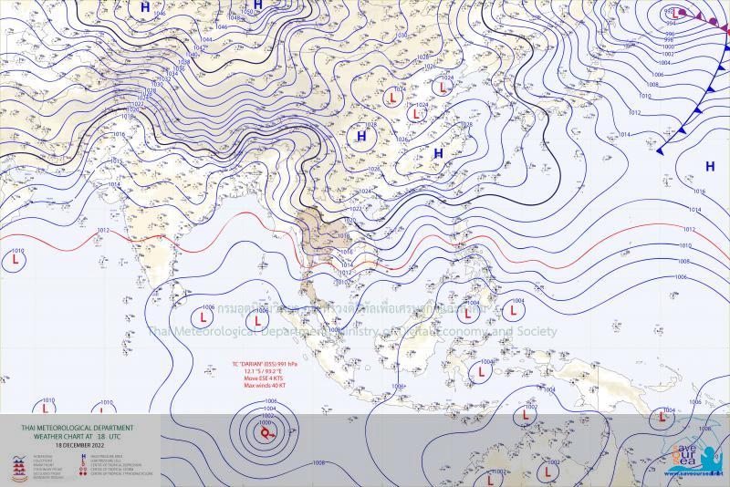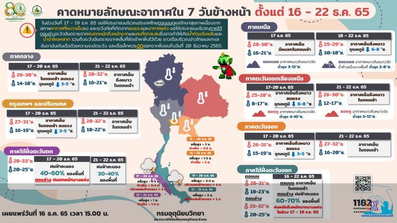 สภาวะอากาศทั่วไป พยากรณ์อากาศ 24 ชั่วโมงข้างหน้า บริเวณความกดอากาศสูงหรือมวลอากาศเย็นกำลังแรงจากประเทศจีนแผ่ลงมาปกคลุมประเทศไทยตอนบน ทำให้บริเวณดังกล่าวมีอากาศเย็นถึงหนาว และอุณหภูมิจะลดลงกับมีลมแรง โดยภาคเหนือและภาคตะวันออกเฉียงเหนืออุณหภูมิจะลดลงอีก 2-4 องศาเซลเซียส ส่วนภาคกลางรวมทั้งกรุงเทพมหานครและปริมณฑล และภาคตะวันออก อุณหภูมิจะลดลงอีก 1-2 องศาเซลเซียส ขอให้ประชาชนดูแลรักษาสุขภาพเนื่องจากสภาพอากาศที่หนาวเย็นไว้ด้วย รวมถึงให้ระวังอันตรายจากอัคคีภัยที่อาจเกิดขึ้นเนื่องจากอากาศแห้งและลมแรง สำหรับมรสุมตะวันออกเฉียงเหนือที่พัดปกคลุมอ่าวไทย ภาคใต้ และทะเลอันดามัน มีกำลังแรง ทำให้ภาคใต้มีฝนตกหนักถึงหนักมากหลายพื้นที่ ส่วนคลื่นลมบริเวณอ่าวไทยมีกำลังแรง โดยอ่าวไทยและห่างฝั่งบริเวณทะเลอันดามันคลื่นสูง 2-4 เมตร บริเวณที่มีฝนฟ้าคะนองคลื่นสูงมากกว่า 4 เมตร ชาวเรือควรเดินเรือด้วยความระมัดระวังและหลีกเลี่ยงการเดินเรือบริเวณที่มีฝนฟ้าคะนอง เรือเล็กบริเวณอ่าวไทยตอนล่างควรงดออกจากฝั่งจนถึงวันที่ 20 ธันวาคม 2565 ฝุ่นละอองในระยะนี้: ประเทศไทยมีการสะสมฝุ่นละออง/หมอกควันเล็กน้อย เนื่องจากลมที่พัดปกคลุมมีกำลังแรงขึ้น กรุงเทพมหานครและปริมณฑล อากาศเย็นกับมีลมแรง และอุณหภูมิจะลดลงอีก 1-2 องศาเซลเซียส อุณหภูมิต่ำสุด 18-20 องศาเซลเซียส อุณหภูมิสูงสุด 27-30 องศาเซลเซียส ลมตะวันออกเฉียงเหนือ ความเร็ว 15-30 กม./ชม. คาดหมาย ในช่วงวันที่ 18 ? 20 ธ.ค. 65 บริเวณความกดอากาศสูงหรือมวลอากาศเย็นกำลังแรงจากประเทศจีนแผ่ลงมาปกคลุมประเทศไทยตอนบน ลักษณะเช่นนี้จะทำให้ประเทศไทยตอนบนมีอุณหภูมิลดลงกับมีลมแรง โดยบริเวณภาคเหนือ และภาคตะวันออกเฉียงเหนืออุณหภูมิจะลดลง 3 - 5 องศาเซลเซียส ส่วนภาคกลาง รวมทั้งกรุงเทพมหานครและปริมณฑล และภาคตะวันออก อุณหภูมิจะลดลง 2 - 4 องศาเซลเซียส สำหรับมรสุมตะวันออกเฉียงเหนือที่พัดปกคลุมอ่าวไทยและภาคใต้จะมีกำลังแรง ทำให้ภาคใต้มีฝนตกหนักถึงหนักมากบางแห่ง ส่วนคลื่นลมบริเวณอ่าวไทยและทะเลอันดามันจะมีกำลังแรงขึ้น โดยอ่าวไทยมีคลื่นสูง 2 - 4 เมตร ทะเลอันดามันห่างฝั่งมีคลื่นสูง 2 - 4 เมตร บริเวณที่มีฝนฟ้าคะนองคลื่นสูงมากกว่า 4 เมตร ส่วนในช่วงวันที่ 21 ? 24 ธ.ค. 65 บริเวณความกดอากาศสูงหรือมวลอากาศเย็นกำลังค่อนข้างแรงยังคงปกคลุมประเทศไทยตอนบนและทะเลจีนใต้ ลักษณะเช่นนี้จะทำให้ประเทศไทยตอนบนมีอุณหภูมิเปลี่ยนแปลงเล็กน้อยแต่ยังยังคงมีอากาศเย็นถึงหนาวและมีหมอกในตอนเช้า ข้อควรระวัง ในช่วงวันที่ 18 - 20 ธ.ค. 65 ขอให้ปร