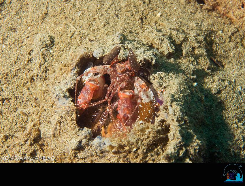 ที่พื้นทราย.....กั้งตั๊กแตน (Mantis Shrimp) โผล่หน้าออกมาจากรู พร้อมจะดีดเหยื่อที่เฉี่ยวเข้ามาใกล้ๆ....