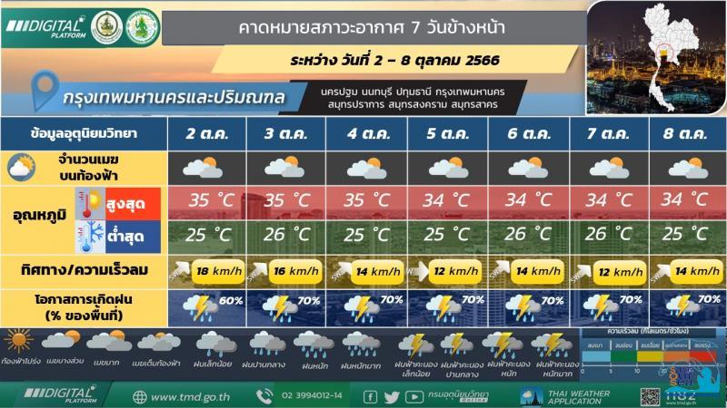 สภาวะอากาศทั่วไป พยากรณ์อากาศ 24 ชั่วโมงข้างหน้า บริเวณความกดอากาศสูงปกคลุมประเทศจีนตอนใต้ ร่องมรสุมพาดผ่านภาคเหนือและภาคตะวันออกเฉียงเหนือ ประกอบกับมรสุมตะวันตกเฉียงใต้พัดปกคลุมทะเลอันดามัน ประเทศไทย และอ่าวไทย ในขณะที่มีหย่อมความกดอากาศต่ำปกคลุมภาคตะวันออกเฉียงเหนือตอนล่าง ประเทศลาวตอนล่าง และประเทศกัมพูชา ลักษณะเช่นนี้ทำให้มีฝนตกหนักบางแห่งบริเวณ ภาคตะวันออกเฉียงเหนือตอนล่าง ภาคกลาง และภาคใต้ รวมถึงมีฝนตกหนักมากบางแห่งบริเวณภาคตะวันออก ขอให้ประชาชนในบริเวณดังกล่าวระวังอันตรายจากฝนตกหนักและฝนที่ตกสะสม ซึ่งอาจทำให้เกิดน้ำท่วมฉับพลันและน้ำป่าไหลหลาก โดยเฉพาะพื้นที่ลาดเชิงเขาใกล้ทางน้ำไหลผ่านและพื้นที่ลุ่ม รวมทั้งเพิ่มความระมัดระวังในการสัญจรผ่านบริเวณที่มีฝนฟ้าคะนองและหลีกเลี่ยงการอยู่ในที่โล่งแจ้ง ใต้ต้นไม้ใหญ่ และป้ายโฆษณาที่ไม่แข็งแรงไว้ด้วย สำหรับทะเลอันดามันตอนบนและอ่าวไทยตอนบนมีคลื่นสูง 1-2 เมตร บริเวณที่มีฝนฟ้าคะนองคลื่นสูงมากกว่า 2 เมตร ส่วนทะเลอันดามันตอนล่างและอ่าวไทยตอนล่างมีคลื่นสูงประมาณ 1 เมตร บริเวณที่มีฝนฟ้าคะนองคลื่นสูง 1-2 เมตร ขอให้ชาวเรือเดินเรือด้วยความระมัดระวังและหลีกเลี่ยงการเดินเรือในบริเวณที่มีฝนฟ้าคะนอง กรุงเทพมหานครและปริมณฑล มีฝนฟ้าคะนอง ร้อยละ 70 ของพื้นที่ กับมีฝนตกหนักบางแห่ง อุณหภูมิต่ำสุด 25-26 องศาเซลเซียส อุณหภูมิสูงสุด 33-34 องศาเซลเซียส ลมตะวันตกเฉียงใต้ ความเร็ว 10-20 กม./ชม. คาดหมาย ในช่วงวันที่ 3 ? 5 ต.ค. 66 ร่องมรสุมจะพาดผ่านประเทศไทยตอนบน ในขณะที่หย่อมความกดอากาศต่ำบริเวณประเทศเวียดนามตอนกลางจะเคลื่อนเข้าสู่ภาคตะวันออก อ่าวไทยตอนบน และภาคกลางตอนล่าง ตามแนวร่องมรสุม ประกอบกับมรสุมตะวันตกเฉียงใต้ที่พัดปกคลุมทะเลอันดามัน ภาคใต้ และอ่าวไทยจะมีกำลังแรงขึ้น ลักษณะเช่นนี้ทำให้ประเทศไทยมีฝนเพิ่มขึ้นและมีฝนตกหนักถึงหนักมากบางแห่ง ส่วนคลื่นลมบริเวณทะเลอันดามันสูง 1 - 2 เมตร บริเวณที่มีฝนฟ้าคะนองคลื่นสูงมากกว่า 2 เมตร ส่วนในช่วงวันที่ 6 ? 8 ต.ค. 66 ร่องมรสุมจะเลื่อนขึ้นไปพาดผ่านภาคเหนือและภาคตะวันออกเฉียงเหนือ ประกอบกับมรสุมตะวันตกเฉียงใต้พัดปกคลุมทะเลอันดามัน ประเทศไทย และอ่าวไทย ลักษณะเช่นนี้ทำให้ประเทศไทยมีฝนตกต่อเนื่องและมีฝนตกหนักบางแห่ง ส่วนภาคเหนือและภาคตะวันออกเฉียงเหนือจะมีฝนเพิ่มขึ้น อนึ่ง พายุไต้ฝุ่น ?โคอินุ? บริเวณประเทศฟิลิปปินส์ มีแนวโน้มจะเคลื่อนตัวลงสู่ทะเลจีนใต้ในช่วงวันที่ 4 ? 5 ต.ค. 66 คาดว่า ในช่วงวันที่ 6 ? 7 ต.ค. 66 จะเคลื