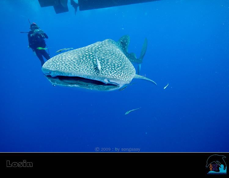 ![]() วันที่..........................27 กันยายน 2552 เวลา..........................14:48 น. สถานที่......................กองหินโลซิน ด้านเหนือ สภาพทั่วไป..................ท้องฟ้าแจ่มใส ทะเลมีริ้วคลื่นเล็กน้อย ลักษณะการพบ..............ที่ผิวน้ำ จนถึงความลึก 15 เมตร เพศ...........................ตัวผู้ น้องก้อง (ดร.ก้องเกียรติ กิตติวัฒนาวงศ์) ผู้เชี่ยวชาญด้านสัตว์ทะเลหายาก แห่งสถาบันวิจัยและพัฒนาทรัพยากรทางทะเล ชายฝั่งทะเลและป่าชายเลน ภูเก็ต ได้ชวนเชิญสองสายและน้องหนุ่มไปช่วยถ่ายภาพการสำรวจแนวปะการังและสรรพชีวิตที่กองหินโลซิน ปัตตานี ซึ่งนับเป็นครั้งที่สองของปี เพื่อนำข้อมูลที่ได้ไปทำหนังสือเกี่ยวกับโลซิน เพื่อนำออกเผยแพร่แก่สาธารณชน การทำงานในสองวันแรก....ทีมงานที่มีอยู่ 20 คน ต้องเผชิญกับพายุคลื่นลมแรง ทำให้การทำงานเป็นไปด้วยความยากลำบาก และทีมงานพากันเมาเรือกันกว่าครึ่งลำ ถึงขนาดที่ทำงานได้ไดฟ์เดียวในวันแรก เราต้องนำเรือเข้าฝั่งไปส่งทีมงานท่านหนึ่งที่เมาเรืออย่างหนักที่เมืองสายบุรี ปัตตานี เมื่อกลับมาที่โลซินอีกครั้ง....เราได้ทราบว่าฉลามวาฬได้แวะมาทักทายนักดำน้ำที่อยู่บนเรือลำอื่นหลายรอบ แต่เราก็ยังไม่ได้เห็นฉลามวาฬเลย จนถึงวันที่สาม ขณะพักผ่อนอยู่บนเรือเพื่อรอลงดำน้ำในไดฟ์สุดท้าย เราจึงได้เห็นลูกฉลามวาฬขนาดเกือบสี่เมตร ขึ้นมาว่ายที่ผิวน้ำ คลอเคลียอยู่กับเรือโชคศุลีที่เป็นพาหนะของเรา