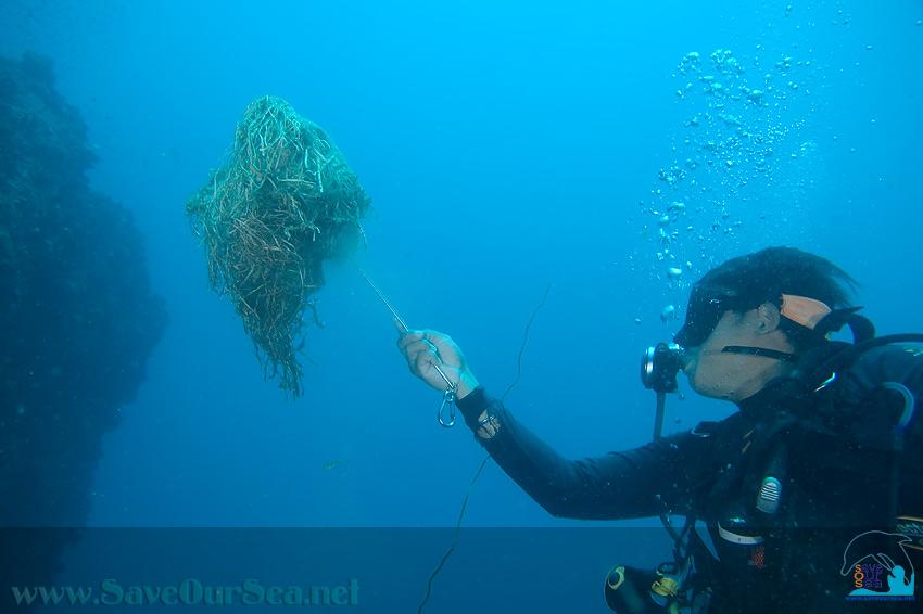 แต่สภาพของมันแปรเปลี่ยนไปมาก จนเราคิดว่าคงไม่ต้องเก็บมันขึ้นมา เพราะนอกจากมีสิ่งมีชีวิตเกาะติดมากมายแล้ว บรรดาปะการังหลายชนิดได้งอกแตกช่อแตกกิ่งลอดตาของอวนขึ้นมาใหม่เต็มไปหมด