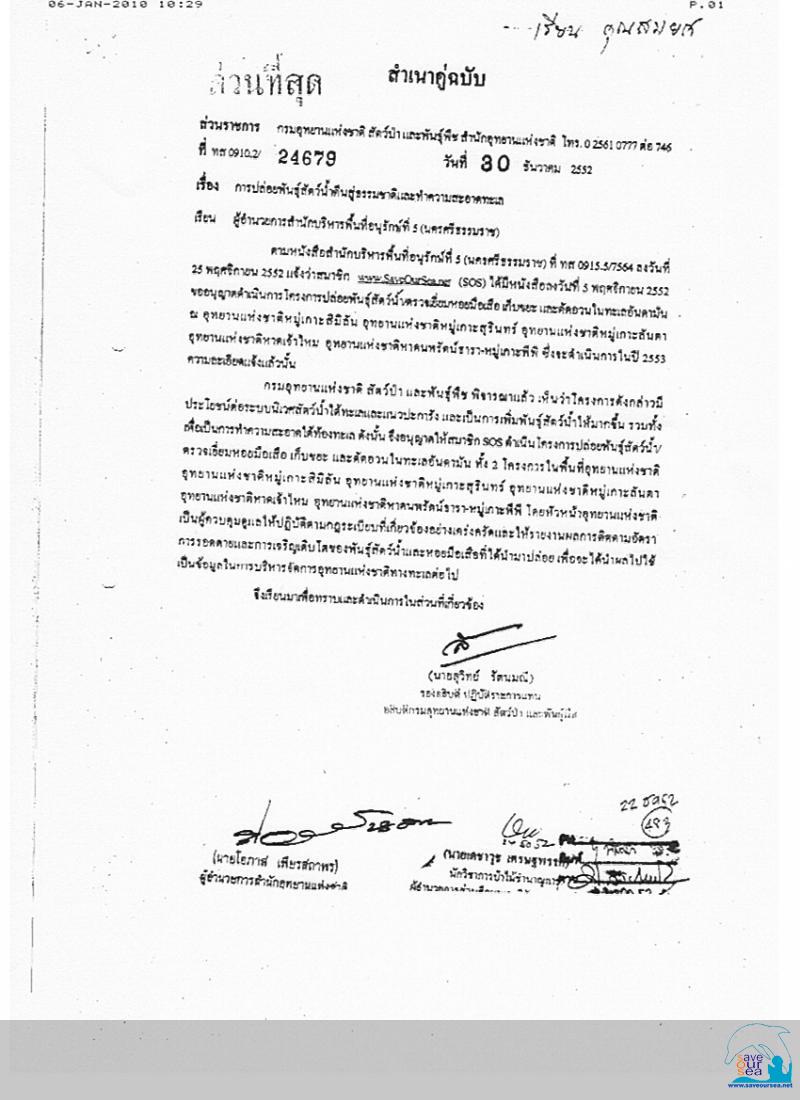 หลังจากที่ได้ทำหนังสือขออนุญาตเข้าไปปล่อยพันธุ์สัตว์น้ำ / ตรวจหอยมือเสือ รวมถึงเก็บขยะ / ตัดเก็บเศษอวน ในเขตของ อช.หมู่เกาะสิมิลัน และ อช. หมู่เกาะสุรินทร์ และได้แนบรายงานผลการปล่อยหอยมือเสือในเขตของ 2 อุทยานฯ ตั้งแต่ปี 2549 - 2552 พร้อมภาพประกอบรวม 9 หน้า ไปยัง ผอ.สำนักบริหารพื้นที่อนุรักษ์ที่ 5 (นครศรีธรรมราช) ตั้งแต่วันที่ 5 พ.ย.52 บัดนี้ ทางกรมอุทยานแห่งชาติ สัตว์ป่าและพันธุ์พืชได้มีหนังสือที่ ทส. 0910/24679 ลว. 30 ธันวาคม 2552 กลับมายัง ผอ.สำนักบริหารพื้นที่อนุรักษ์ที่ 5 (นครศรีธรรมราช) แล้ว โดยได้อนุญาตให้สมาชิก sos เข้าไปดำเนินการตามที่ขอได้ แต่มีเน้นว่า "ให้รายงานผลการติดตามอัตราการรอดตายและการเจริญเติบโตของพันธุ์สัตว์น้ำและหอยมือเสือที่ได้นำมาปล่อย" ด้วย