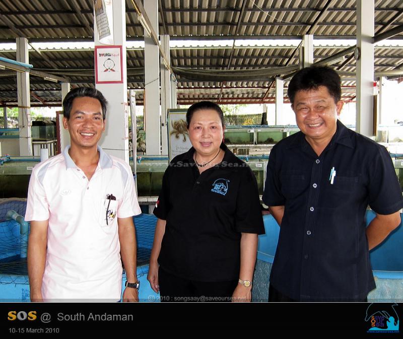 ระหว่างที่รอการแพ็คปลาอยู่นั้น ท่าน ผอ.ไพบูลย์ หรือที่เราเรียกกันว่า ผอ.แอ๋ว ก็ขี่รถเครื่องเข้ามาเพื่อทักทายเรา .... เราจึงขอถ่ายรูป 3 ผู้ยิ่งใหญ่ร่วมกันตามธรรมเนียม เมื่อปลาลงถุง อัดอ๊อกซิเจนลงไป ผูกมัดปากถุง และใส่ลงกล่องโฟมอีกชั้นแล้ว ก็ลำเลียงขึ้นตู้ซิ่ง สองสายจึงกล่าวขอบคุณและกล่าวลาเพื่อเดินทางต่อไปให้ถึงท่าเรือรัษฎา ภูเก็ต ก่อนที่จะมืด