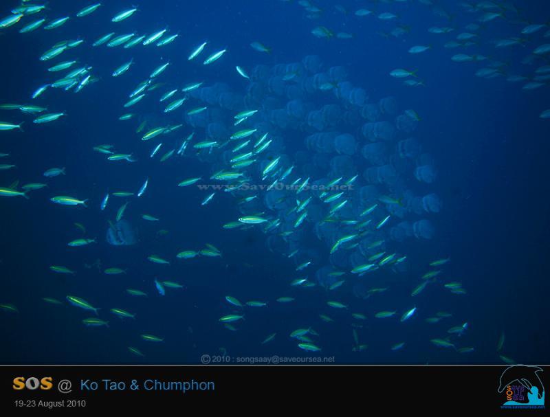 ที่กลางน้ำห่างจากกองหิน....หลังฝูงปลากล้วย (Fusillier) มีฝูงปลาอะไรว่ายอยู่นะ....