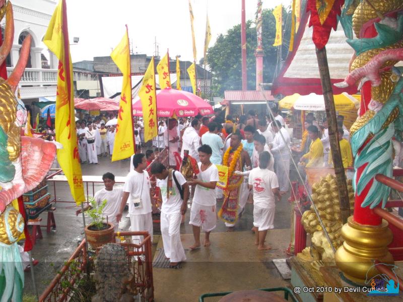 การเดิน อาจจะไม่เป็นขบวนเท่าไรนัก เพราะขบวนแห่ จะนำด้วย รถที่ประทับของพระผู้ใหญ่ ขบวนเกี้ยวที่วางพระพุทธรูปจากอ๊าม (ขบวนนี้เค้าก็จะเล่นกับประทัดที่ชาวบ้านเตรียมไว้ คือ แขวนประทัดยาวหลายๆ เมตร หรือเตรียมประทัดไว้ และก็จุด คนที่หามเกี้ยวก็เดินย้ำประทัดนั่นเอง) ม้าทรงทุกรูปที่ผ่านพิธี โดยจะผ่านไปตามจุดต่างๆๆ ซึ่งบ้านที่เค้าทานเจ ก็จะมีโต๊ะวางน้ำชา และผลไม้ไหว้ และก็อาจจะมีท๊อฟฟี่ ไว้ให้ม้าทรงที่เป็น นาจา มาหยิบกินด้วย