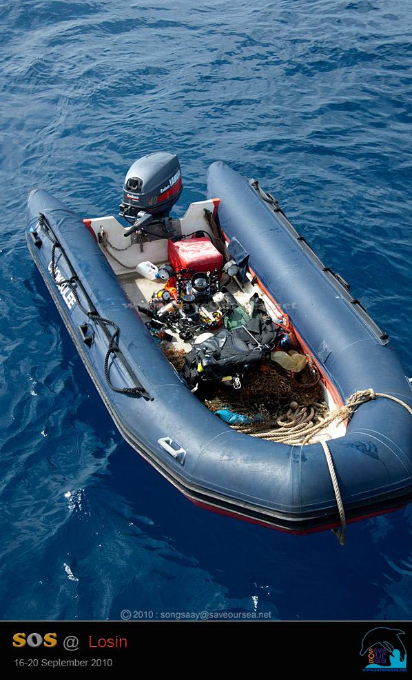 เรือดิงกี้ที่นายน้องดูแลอยู่ มีหน้าที่ทั้งรับขยะ รับอุปกรณ์ดำน้ำต่างๆ รวมทั้งกล้องด้วย