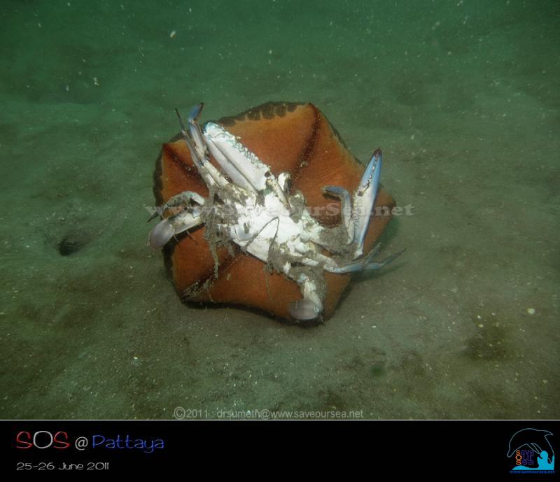 และที่ทำให้แปลกใจอีกอย่างหนึ่งก็คือ....ดาวหมอนปักเข็ม (Cushion Starfish) กินปูม้า หรือเพียงแต่ว่าจะใช้ซากปูม้าเป็นที่ยึดเกาะเท่านั้น....