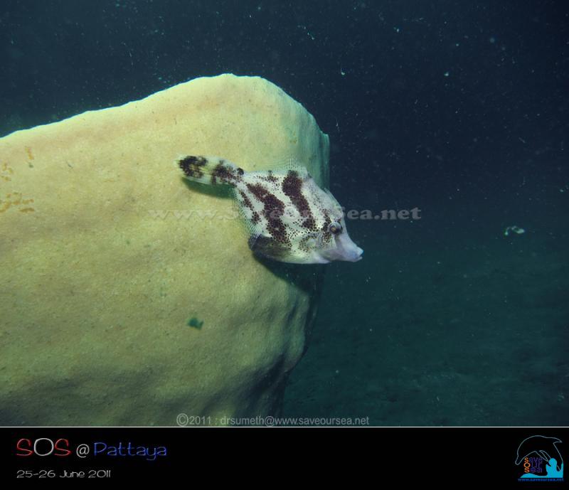 ที่ดีใจจนยิ้มได้เมื่อเห็น ก็คือ ฟองน้ำทรงแจกัน (Vase Sponge) สูงเกือบเมตร สีเขียวอ่อน ดูสวยงามและอยู่ในสภาพสมบูรณ์ ตั้งอยู่บนพื้นทราย มีปลาวัว Belly Leather Jacket) เคล้าเคลียอยู่ไม่ห่าง