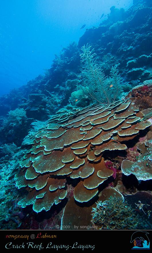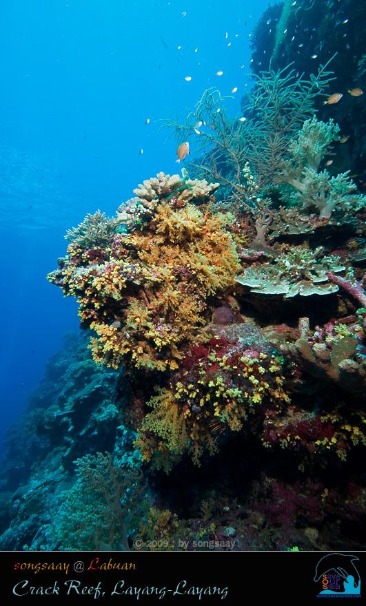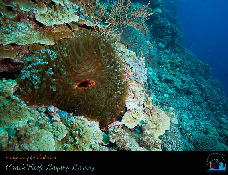 ขนาดที่ Crack Reef ซึ่งถือว่าเป็นจุดที่สมบูรณ์ที่สุดของ Layang-Layang ยังมีดอกไม้ทะเลและปลาการ์ตูนให้เห็นอยู่อย่างละตัว คือ เป็นดอกไม้ทะเลหนวดยาว ที่ปลายหนวด(บางส่วน)เหมือนหลอดไฟ และปลาการ์ตูนที่อาศัยอยู่เป็น ปลาการ์ตูนมะเขือเทศ (Tomato Anemonefish) ซึ่งตัวโตและสวยมาก อยู่ตัวเดียวเปลี่ยวเอกาอย่างนี้แล้วจะแพร่พันธุ์ได้อย่างไรกันนะ....