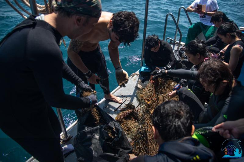 หลังจากเก็บขยะเศษอวนขึ้นมาทุกครั้ง เราจะช่วยกันแยกขยะแต่ละชนิด พวกกุ้งหอยปูปลา ที่ติดอวนมาเราก็ปล่อยกลับคืนลงทะเล