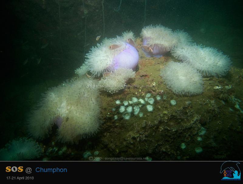 ขอแปะมือมาโพสต์ช่วงปิดทริปแทนคุณสายชลครับ .... จาก SOS Pinnacle I ... เราตั้งใจจะไปดำไดฟ์สุดท้ายที่เกาะหลักง่าม แต่ธรรมชาติไม่เป็นใจ ลมเกิดแรงขึ้นมาเสียเฉยๆ จนกัปตันชัยต้องเปลี่ยนแผนนำเรือเข้าไปหลบคลื่นและลมที่เกาะง่ามใหญ่ และในเมื่อไปไหนไม่ไหวแล้ว เราจึงต้องดำปิดทริปกันที่เกาะง่ามใหญ่ ด้านตะวันออก เกาะง่ามใหญ่ เดิมจะมีปะการังหนังปกคลุมก้อนหินเต็มไปหมด แต่หลังจากที่พายุเกย์พัดเข้าถล่มชุมพร เกาะง่ามใหญ่ถูกแรงคลื่นและกระแสน้ำโหมเข้ากระแทกอย่างรุนแรง จนปะการังหนังหลุดลอยหายไปเกือบหมด เหลือแต่กองหินเปล่าๆไว้ให้ดูเท่านั้น เป็นเวลานานมากที่สองสายไม่ได้มาดำที่ด้านนี้ของเกาะง่ามใหญ่ จึงเป็นโอกาสดีที่จะลงไปสำรวจดูเสียหน่อยว่า ปะการังหนังหนาแน่นขึ้นหรือไม่ แต่ ... ยังไม่ทันเห็นปะการังหนัง ก็ต้องพบภาพสะเทือนใจเสียแล้ว บรรดาดอกไม้ทะเล (Sea Anemones) บนกองหินเริ่มเปลี่ยนสี บางตัวกลายเป็นสีขาวไปเรียบร้อยแล้วด้วย
