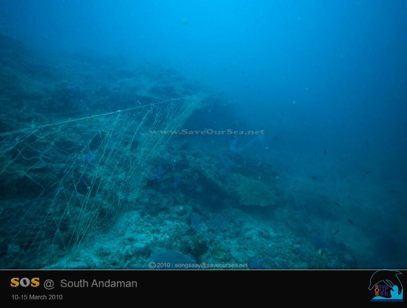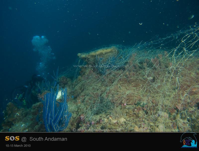 พาดเกี่ยวทั่วไปหมด ทั้งปะการังแข็ง กัลปังหาสีฟ้า ดอกไม้ทะเล ฯลฯ