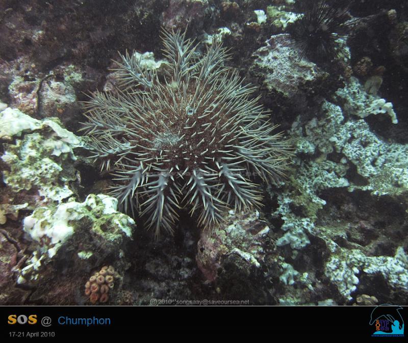 ดาวมงกุฎหนามที่มีให้เห็นเพียงตัวเดียวกำลังดูดกินปะการังอยู่อย่างเอร็ดอร่อย ถูกเชิญออกไปอยู่ที่พื้นทราย....