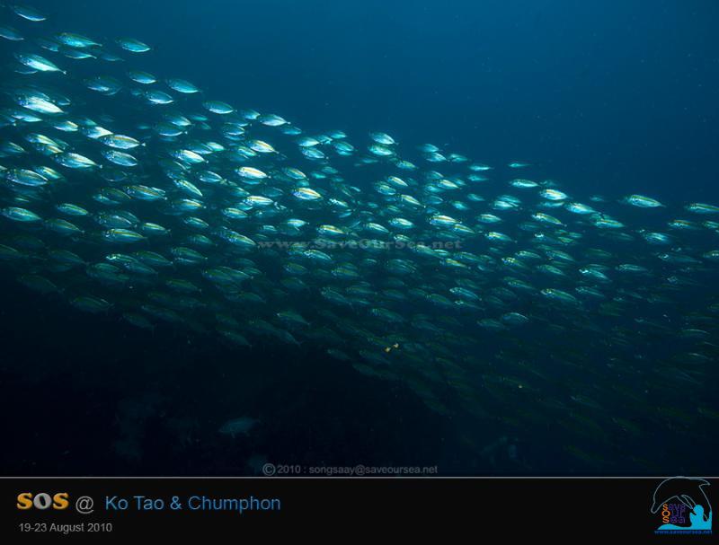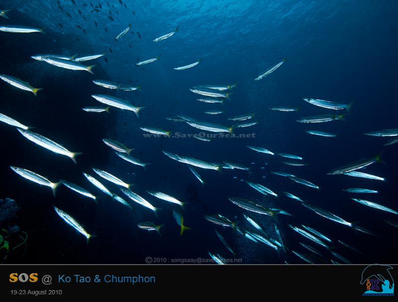 ลูกปลาสากหรือปลาน้ำดอกไม้ว่ายพุ่งผ่านนักดำน้ำไปมาเหมือนฝนเหล็ก....
