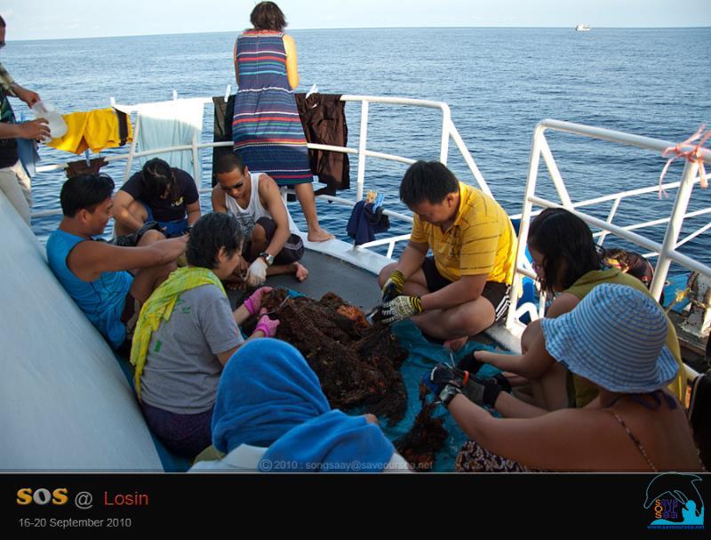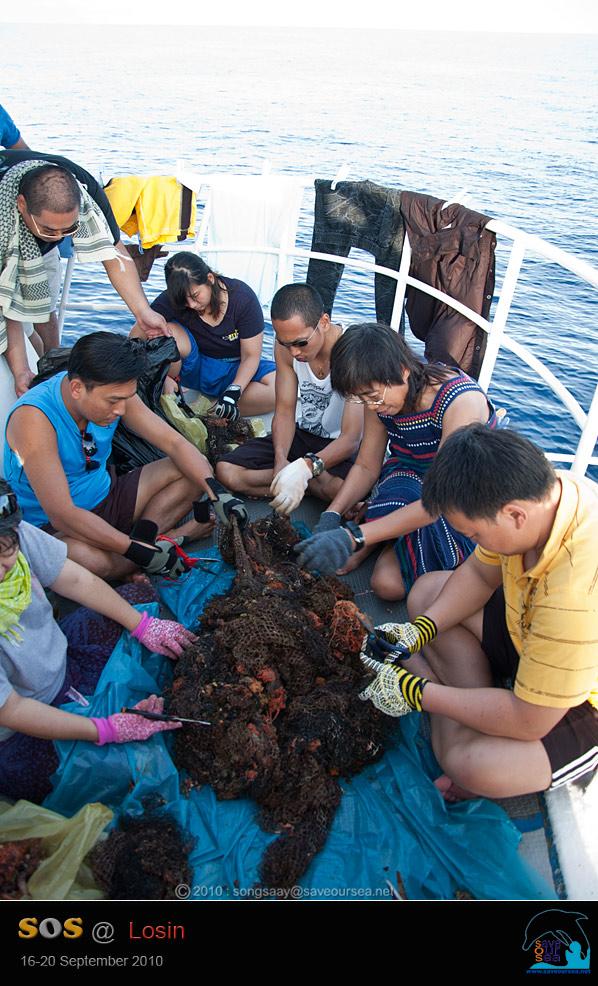 บางครั้ง เศษอวนที่เก็บขึ้นมาอยู่ในระดับความลึกที่ไม่เอื้ออำนวยให้เราทำงานได้ละเอียดนัก .... เมื่อขึ้นมาอยู่บนเรือแล้ว เราจึงต้องมารวมพลังสามัคคีกัน ตัดเลาะเอาสิ่งมีชีวิตที่เกาะติดผืนอวนออก แล้วส่งกลับลงน้ำไปทั้งหมด เช่น ฟองน้ำ เศษปะการัง ปู ปลา ฯลฯ