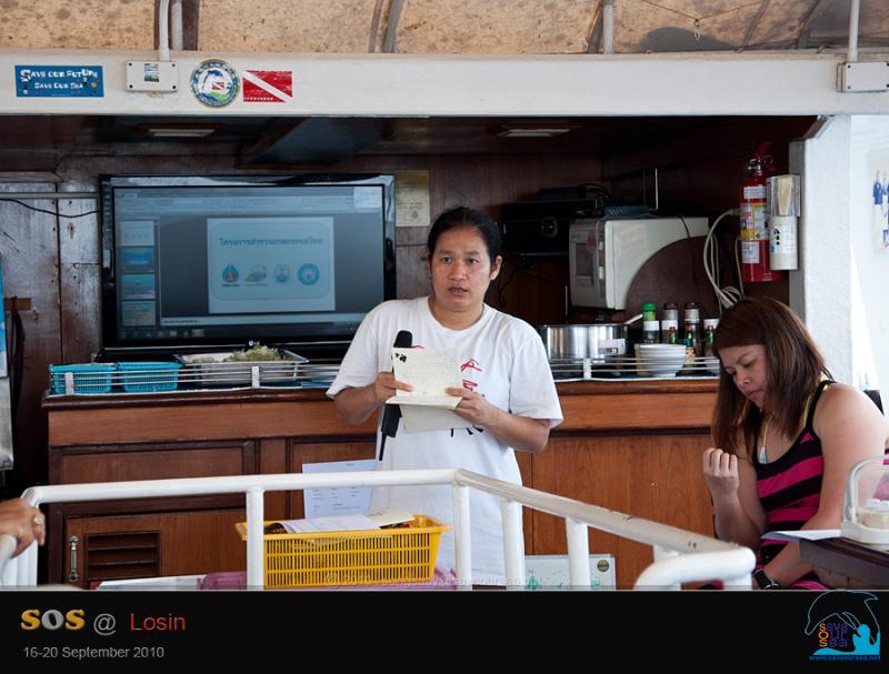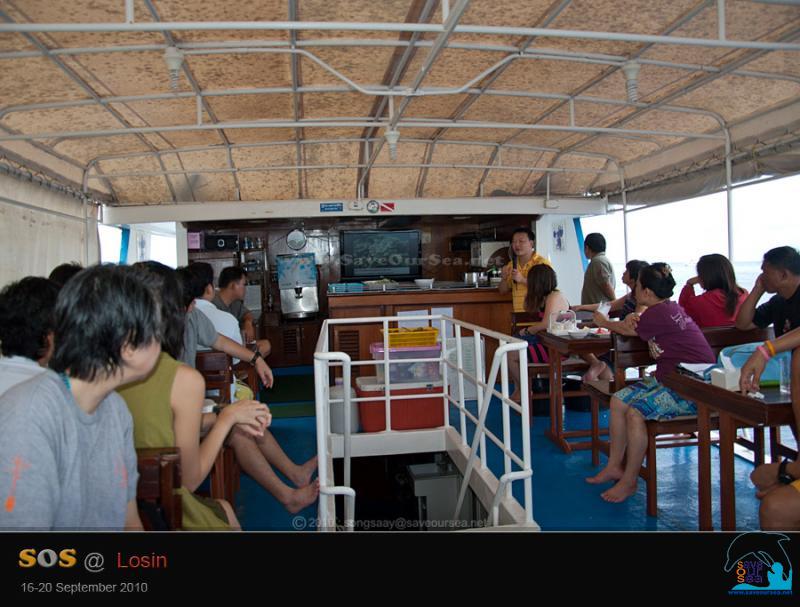 ภารกิจอีกอย่างหนึ่ง นอกเหนือไปจากการเก็บขยะ / เศษอวน คือ การทำ Reef Watch ไหนๆก็รับอาสา และรับการอบรมกันมาแล้ว และถ้ามีเศษขยะและเศษอวนให้เก็บกันไม่มากนัก เราก็พอจะทำ Reef Watch กันได้บ้าง จริงๆแล้ว น้องลูกหยีมาด้วย แต่พอถึงวันที่จะทำ Reef Watch ... น้องลูกหยีเป็นป่วย skip ไดฟ์เช้า หมอเมธจึงต้องรับหน้าที่พิธีกร เอ๊ย ... วิทยากรแทน และน้องตุ๊กแกผาช่วยเสริมเรื่องวิธีเก็บข้อมูล
