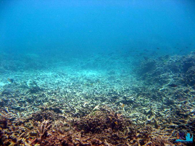 ความเสียหายไม่แตกต่างกัน ปะการังเขากวางเสียหายทั้งหมด มีราบเป็นหน้ากลองเป็นบางแห่ง ที่หนาแน่นมากที่หินกลองยังพอยืนหยัดด้วยตอเท่านั้น