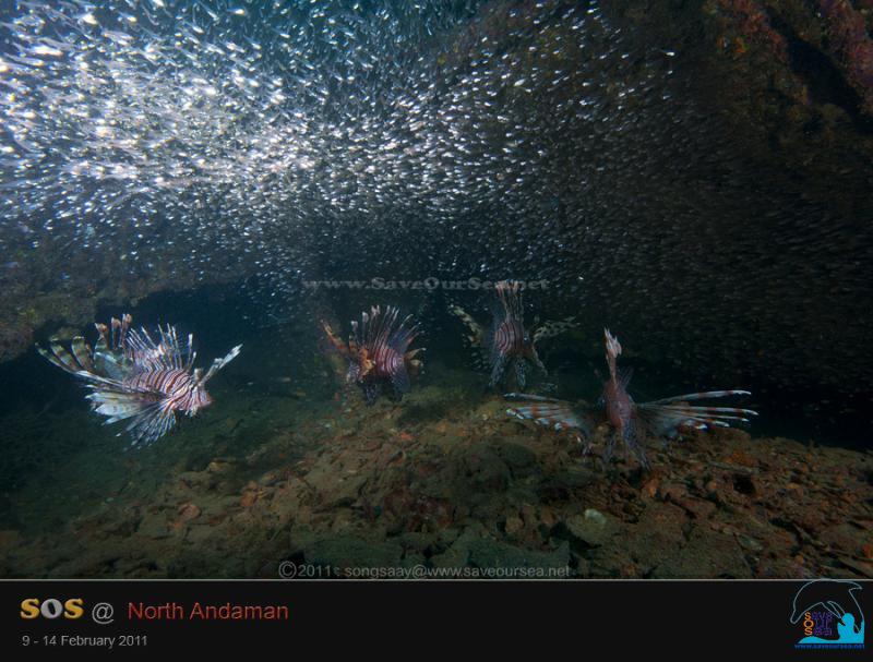 ใต้กองเครื่องมือหนัก มีปลาสิงโตทะเลฝูงใหญ่อยู่กันเป็นฝูง ด้านบนมีลูกปลาตัวเล็กๆว่ายกันอยู่หนาแน่น