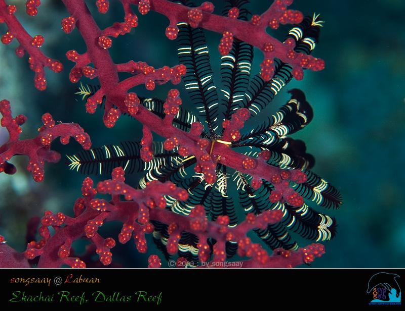 ดาวขนนกสีขาวสลับดำเกาะติดแน่นอยูบนกิ่งกัลปังหาสีม่วงแดง สวยดีค่ะ....