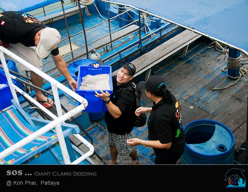 หอยมือเสือที่ถูกห่อด้วยผ้าสำลีชุบน้ำทะเลเพื่อให้ความชุ่มชื้นถูกขนขึ้นรถตู้ของศูนย์ฯ คลองวาฬ เพื่อเดินทางไปยังท่าเรือมารีน พัทยาใต้ ที่ท่าเรือมารีน พวกเราอีก 7 คนคอยอยู่แล้ว กระบะใส่หอยมือเสือทั้ง 500 ตัว ถูกขนขึ้นไปบนเรือมารีน น้องดู๋และน้องบ๊วย ได้ร่วมกับสมาชิกหญิงชายของ sos ที่แข็งแรง ขนกระบะน้องหอยขึ้นเรือมารีน 1 ที่จอดเทียบท่าอยู่....