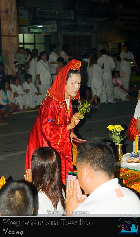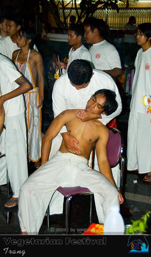 คงจะเดินกันมาตั้งแต่บ่าย วนไปวนมาบนถนนหลายเส้น ณ จุดนี้ คงจะเป็นปลายทางของขบวนแห่แล้ว .... ม้าทรงหลายคน มาหยุดถอดเครื่องทรมานตัว และเชิญเจ้าออกจากทรงกันบริเวณนี้
