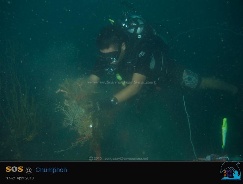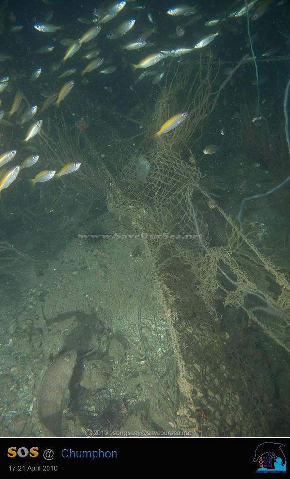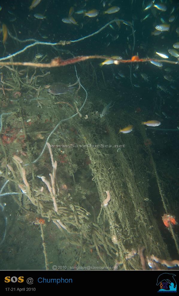 ไม่ค่อยชอบใจเลยค่ะ.....ที่ความลึกราว 18 เมตร อวนเส้นยาวเกาะเป็นแนวยาวจากกองหินด้านตะวันออกอ้อมไปทางด้านเหนือ ปล่อยไว้ไม่ได้ค่ะ....อย่างนี้ต้องตัด....