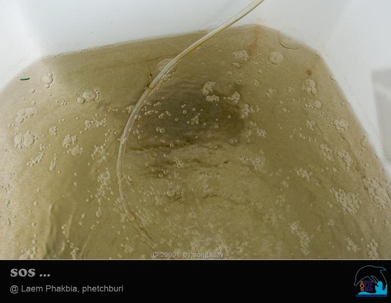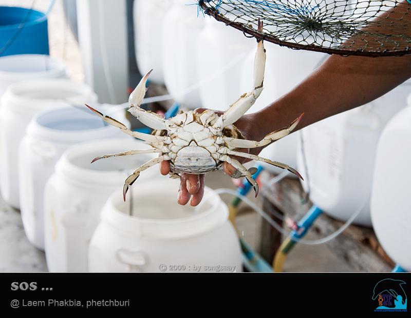 ถ้าสงสัยว่าในถังมีอะไรบ้าง ก็ชะโงกตามสองสายไปดูกันครับ .... มีแม่ปูม้าอยู่ถังละ 1 ตัว พร้อมไข่ที่ลอยฟ่องเต็มถังจนทำให้น้ำขุ่น